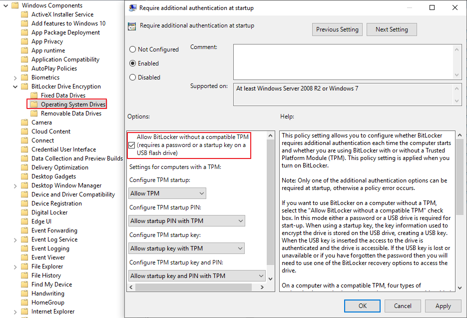 시작시 추가 인증 요구 라는 정책을 사용해 준다. 이 정책이 사용되어야 bitlocker 사용이 가능하다.